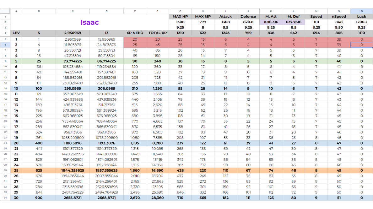 I stuck with the basic stats of Attack, Defense, Magic Attack, Magic Defense, Speed, and Luck. All six of these apply to battle, with Luck having some effects outside of battle. Then there is the traditional HP, MP, XP system. The last mechanics from the players side was the power pacing. Designing the XP Leveling, Stat Leveling, Magic Power Leveling, and Sword Tech leveling was the most complex part of the system. I was able to maintain balance between all characters, classes, and battle strategies.